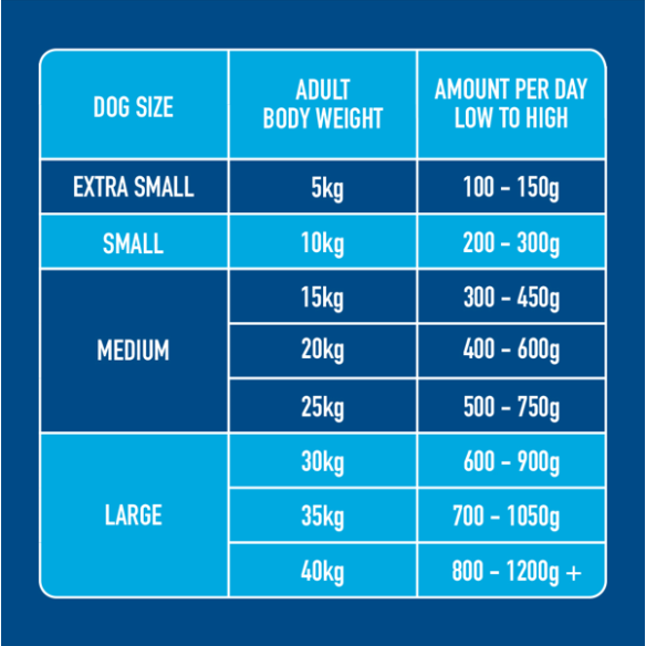 Our puppy formula is sold in 500g trays or 1.4kg chubbs (click above to select the correct size for your dog). Feed 4-6% of the dog's current ideal body weight per day, ideally spread over two meals. Working dog food.